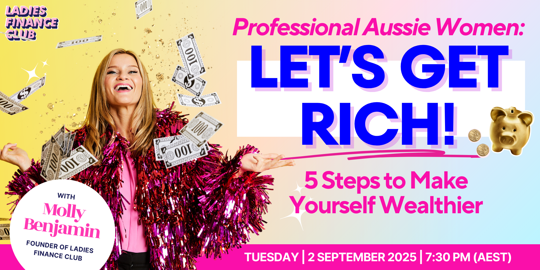 Join our FREE workshop where Molly Benjamin will walk you through her 5-step Money Plan that’s helped tens of thousands of Aussie women get organised, build wealth, and feel confident with their finances.